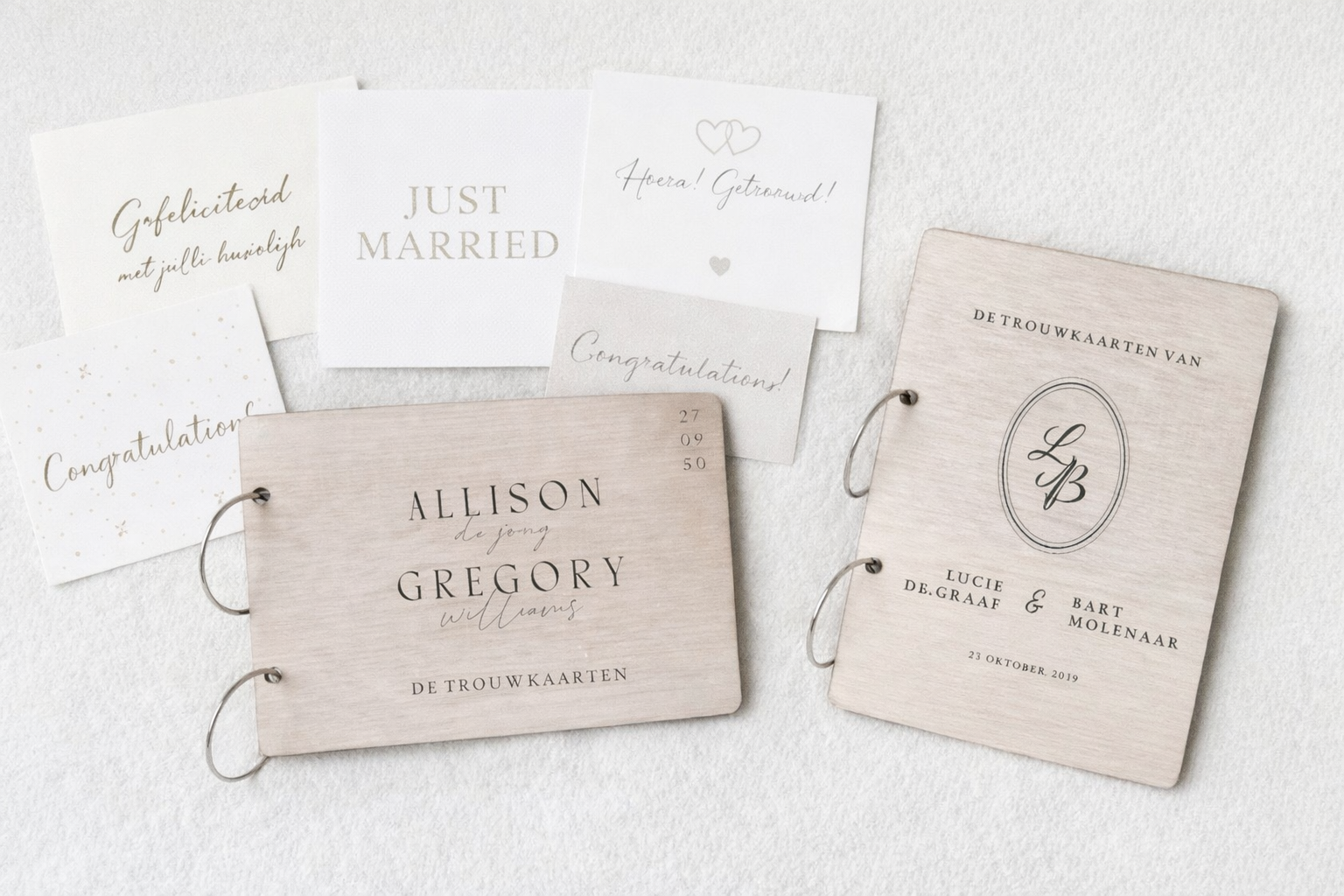 Na jullie bruiloft blijven de kaarten vol lieve wensen, warme woorden en geluksmomenten een tastbare herinnering aan die ene, bijzondere dag. Met onze houten bewaarbundel voor trouwkaarten geef je deze waardevolle kaarten een plek die ze verdienen.